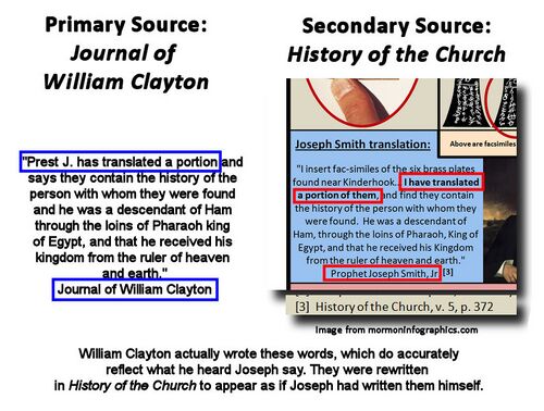 The quote in question was written in William Clayton's journal. It was rewritten in the first person (as if Joseph Smith had said it himself) when it was included in History of the Church. Clayton's journal is the primary source, which was used in History of the Church (a secondary source).