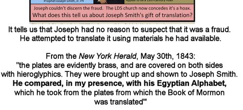 A critical graphic from "mormoninfographics" states that "Joseph didn't discern the fraud. The LDS Church now concedes it's a hoax. What does this tell us about Joseph Smith's gift of translation?" | |||