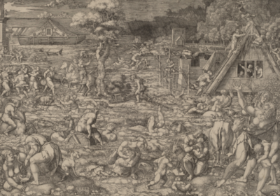 [[File:DirkDelugePublicDomain.png|400px|thumb|right |<small>"The Deluge," engraving by Dirck Vellert (1544), public domain image from Metropolitan Museum of Art.</small>]] | |||