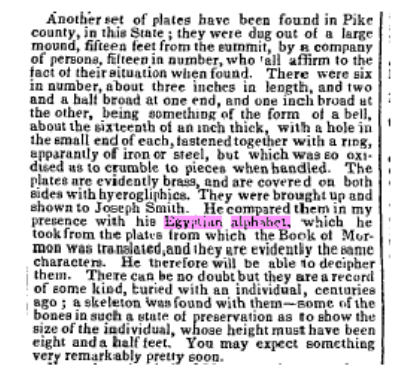 The plates are evidently brass, and are covered on both sides with hieroglyphics. They were brought up and shown to Joseph Smith. He compared them, in my presence, with his Egyptian Alphabet…and they are evidently the same characters. He therefore will be able to decipher them.
