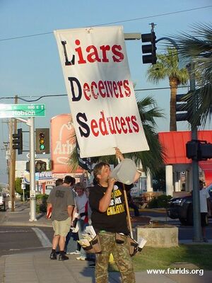 An anti-Mormon protester at the Church's 2003 Mesa Easter Pageant expresses his view that "Mormonism is worse than child molesting homosexuals." Most anti-Mormon writers do not reach this level of vitriol, though some do. Unfortunately, a thriving anti-Mormon book and video industry spreads the misinformation that encourages such views and behavior.
