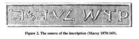 Although there were questions about the Bat Creek stone's origins, these were strengthened by a 2004 paper by Mainfort and Kwas. In it, they demonstrate that the text for the stone was copied from an 1870 book on Freemasonry: Robert Macoy, General History, Cyclopedia, and Dictionary of Freemasonry (New York, Masonic Publishing Co., 1870), 169. [See Figure 2.] The Masonic use of the inscription comes from a Jewish coin, reading "Holiness to the Lord," or "Holy to Yahweh." [6]