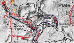 La intercesion de Cocos y las placas caribeñas arrojan resultados con multiple volcanes (se muestra en los puntos rojos en este mapa USGS) atravez de America Central.