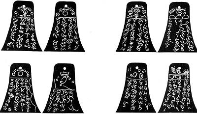 Inserto facsímiles de los seis planchas de bronce que se encuentran cerca de Kinderhook, en el condado de Pike, Illinois, el 23 de abril, por el Sr. Robert Wiley y otros, mientras que la excavación de un gran montículo. Encontraron un esqueleto de unos seis pies de distancia de la superficie de la tierra, que debe haber permanecido nueve pies de alto. Las placas se encuentran en el seno del esqueleto y estaban cubiertos por ambos lados con caracteres antiguos. He traducido una parte de ellos, y encontrar que contienen la historia de la persona con la que se encontraron. Era descendiente de Cam, los lomos de Faraón, rey de Egipto, y que recibió su reino desde el Gobernante de los cielos y la tierra.