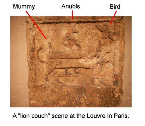 Esta viñeta se llama una "escena de sofá león" por los egiptólogos. Por lo general representa el embalsamamiento del individuo fallecido en preparación para el entierro. Sin embargo, esta escena en particular sofá león representa la resurrección de Hor (figura 2), ayudado por el dios egipcio Anubis (3). [2]